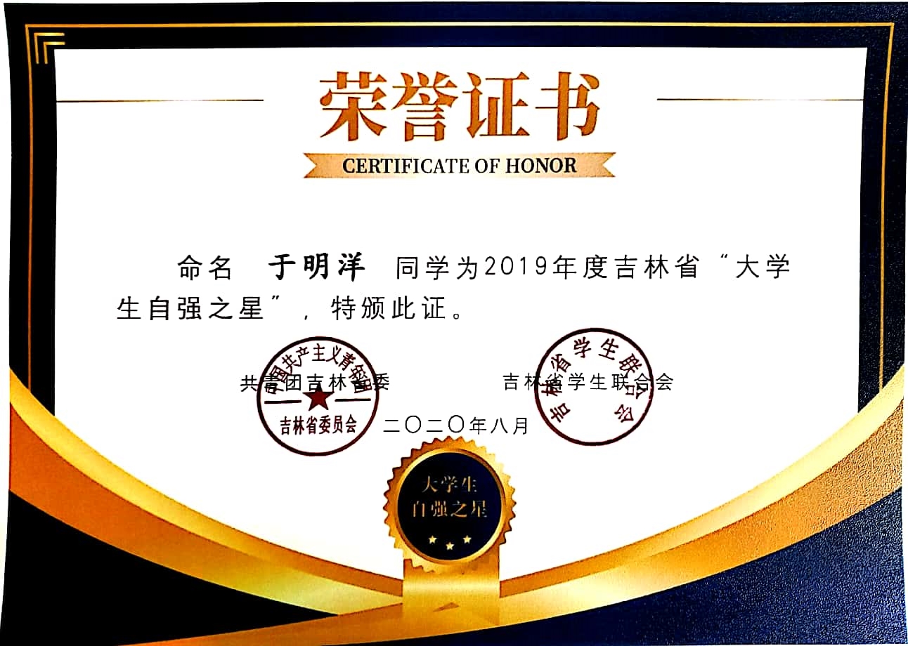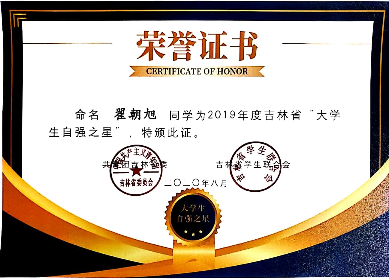 为深入宣传贯彻习近平新时代中国特色社会主义思想和党的十九大精神,在当代大学生中选树一批可亲、可敬、可信、可学的先进典型,鼓励青年学生争做社会主义核心价值观的坚定信仰者、积极传播者、模范践行者,按照团省委、省学联《关于开展2020年吉林省“大学生自强之星”寻访活动的工作通知》要求,经校团委严肃推荐、认真把关,团省委、省学联评选,学校市政与环境工程学院建筑与能源环境工程专业建环172班翟朝旭同学、市政与环境工程学院给排水科学与工程183班于明洋同学获得2019年度吉林省“大学生自强之星”荣誉称号。