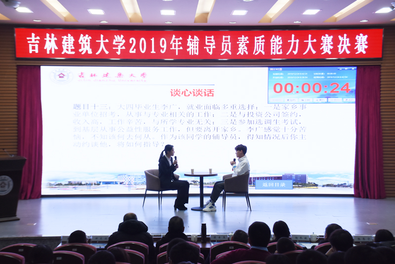 为深入学习贯彻习近平新时代中国特色社会主义思想和党的十九大精神,贯彻落实全国高校思想政治工作会议和全国教育大会精神,落实立德树人根本任务,不断提升我校辅导员的理论水平、专业素养和职业能力,进一步推进辅导员队伍专业化、职业化建设,学校举办了2019年辅导员素质能力大赛。12月24日,大赛决赛在逸夫教学楼报告厅举行。