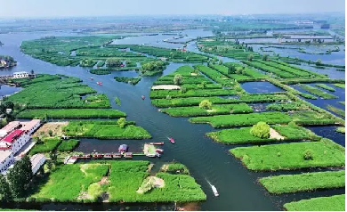 河北雄安新区白洋淀内天蓝水清、芦苇鲜绿,游船往来穿梭,构成一幅“城淀相依、共生共融”的美丽画卷。图为游船在雄安新区白洋淀内行驶。图片来源:《瞭望》